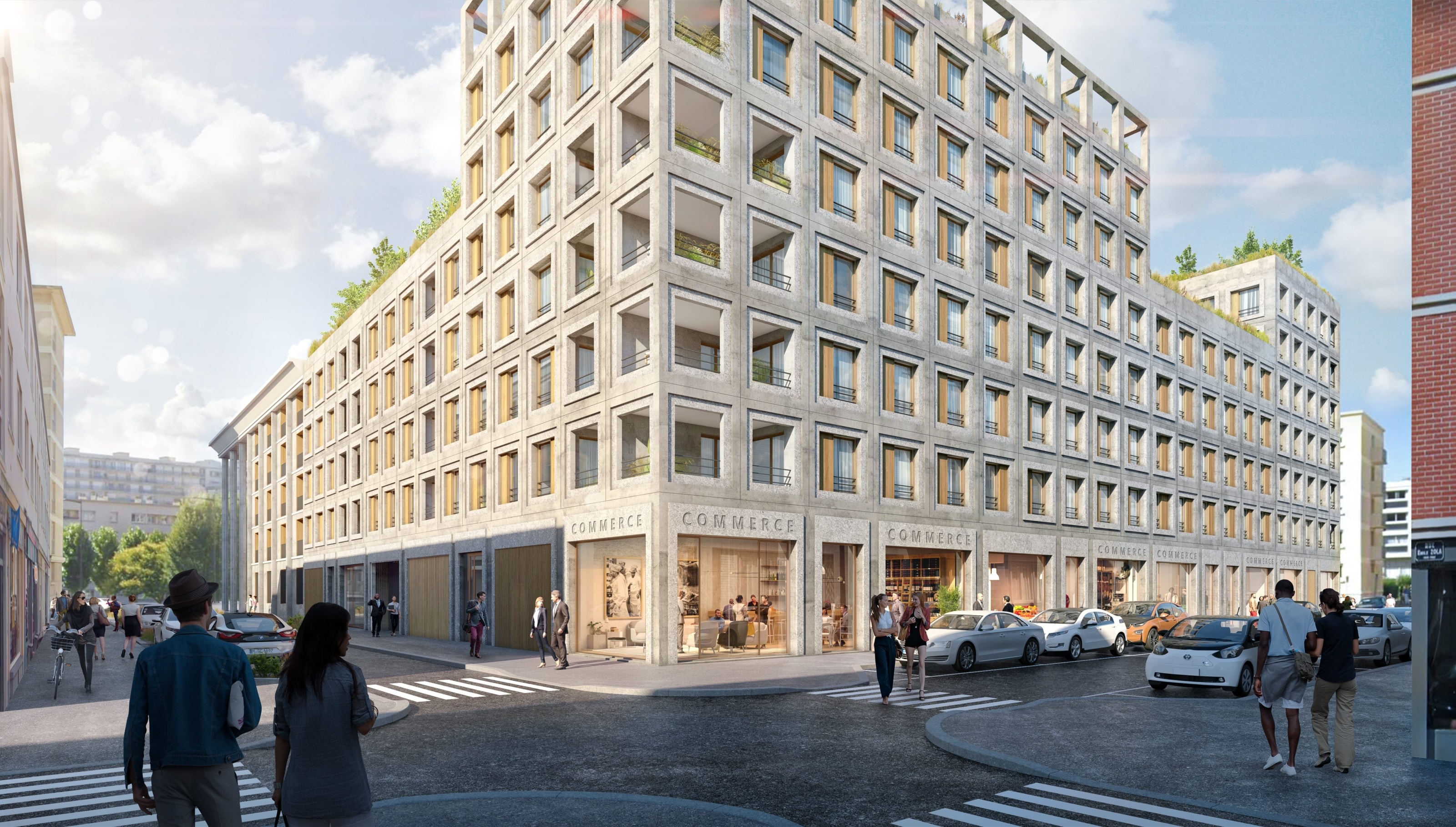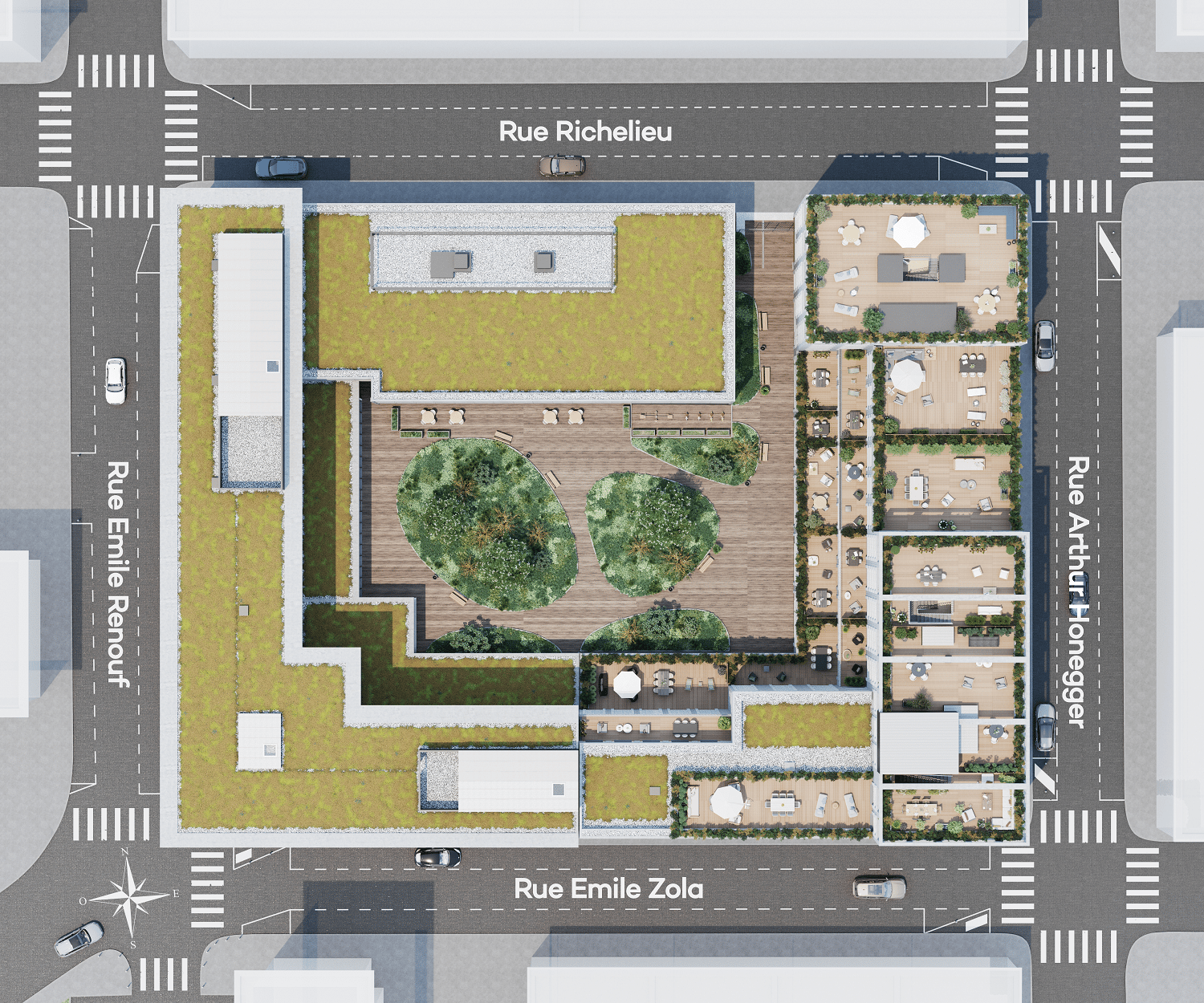 Scènes de vie se distingue également par le traitement soigné pour l’ensemble de l’aménagement paysager. Ainsi, son cœur d’îlot est largement végétalisé. Les toitures offrent aussi de beaux espaces plantés.