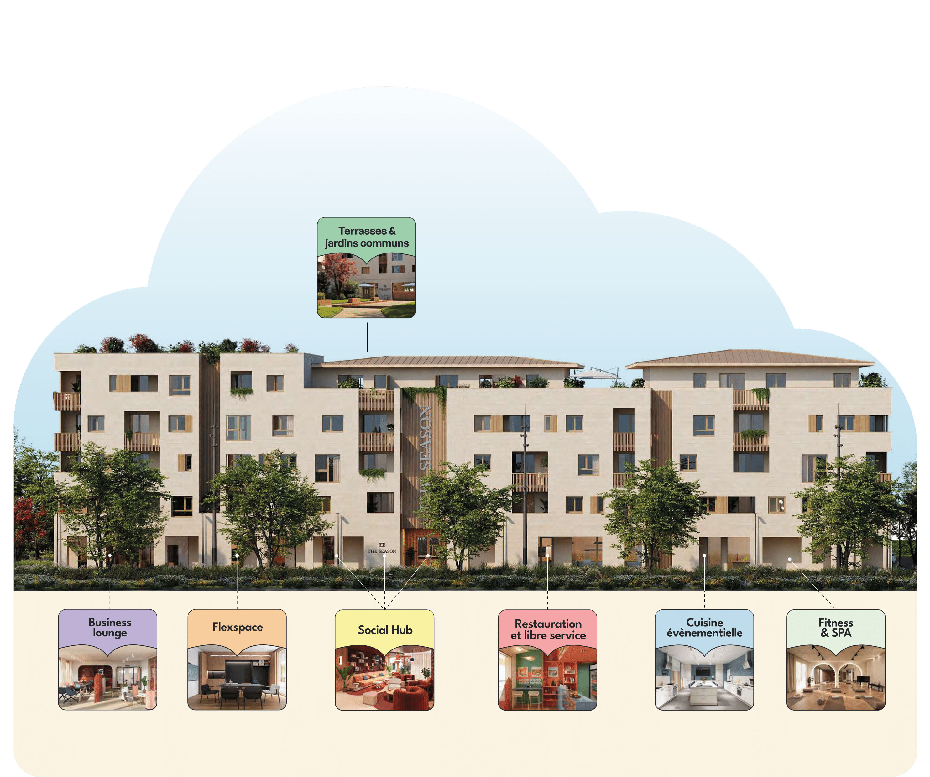 Des espaces pensés pour le bien-être de vos futurs locataires : Un Business Lounge de 120 m², idéal pour télétravailler ou réviser dans le calme. Un Social Hub central avec coin barista, conciergerie et espace food connecté. Une salle de sport 100% équipée pour se dépasser et un grand Sauna pour se détendre. Un espace cuisine évènementielle privatisable pour les grandes tablés, évènements familiaux, cours de cuisine… Des chambres guests louables à la nuitée pour accueillir proches et famille. De nombreux espaces extérieurs paysagers : jardin, boulodrome, parcours santé… Le tout animé et coordonné par un Experience Manager, garant du bon fonctionnement des services, de la qualité de vie et du programme d’animation à l’année au sein de la résidence.